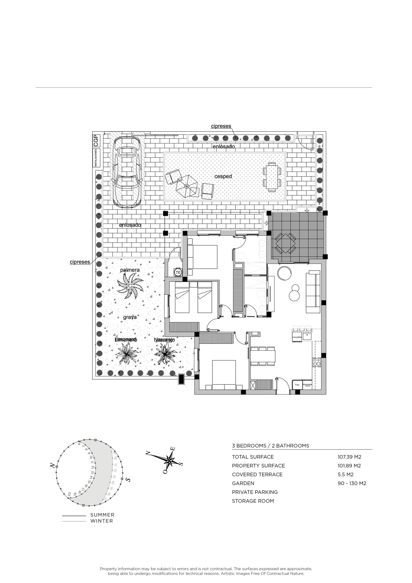 Het is een prachtig wooncomplex dat bestaat uit verschillende soorten woningen: appartementen en halfvrijstaande villa’s. De appartementen hebben 2 slaapkamers en 2 badkamers in model Adhara en 3 slaapkamers en 2 badkamers in model Jazmín, evenals een open keuken en woon-eetkamer. Je kunt kiezen voor een benedenverdieping met een mooie privétuin of een bovenverdieping met een ruim solarium. De halfvrijstaande villa’s hebben 3 en 3 badkamers, open keuken, grote woonkamer en solarium en privétuin.