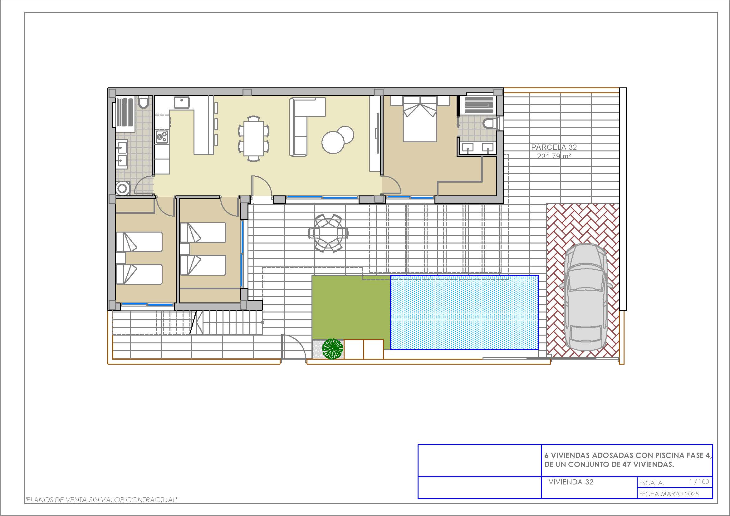 Het interieurontwerp van deze villa’s in La Herrada, Los Montesinos, combineert functionaliteit en moderne stijl om een gastvrije en comfortabele sfeer te creëren. De villa’s zijn slim verdeeld over twee verdiepingen en bieden een open keuken, woon- en eetruimte op de begane grond, samen met een grote slaapkamer compleet met kleedkamer en badkamer. Boven zijn er nog twee slaapkamers, een badkamer en een ruim terras. De interieurs zijn ontworpen met hoogwaardige afwerkingen en functies zoals inbouwkasten en pre-installatie voor airconditioning. Deze binnenruimtes zijn ontworpen om het comfort en de functionaliteit te maximaliseren, waardoor een perfect huis ontstaat waar het hele gezin van kan genieten.