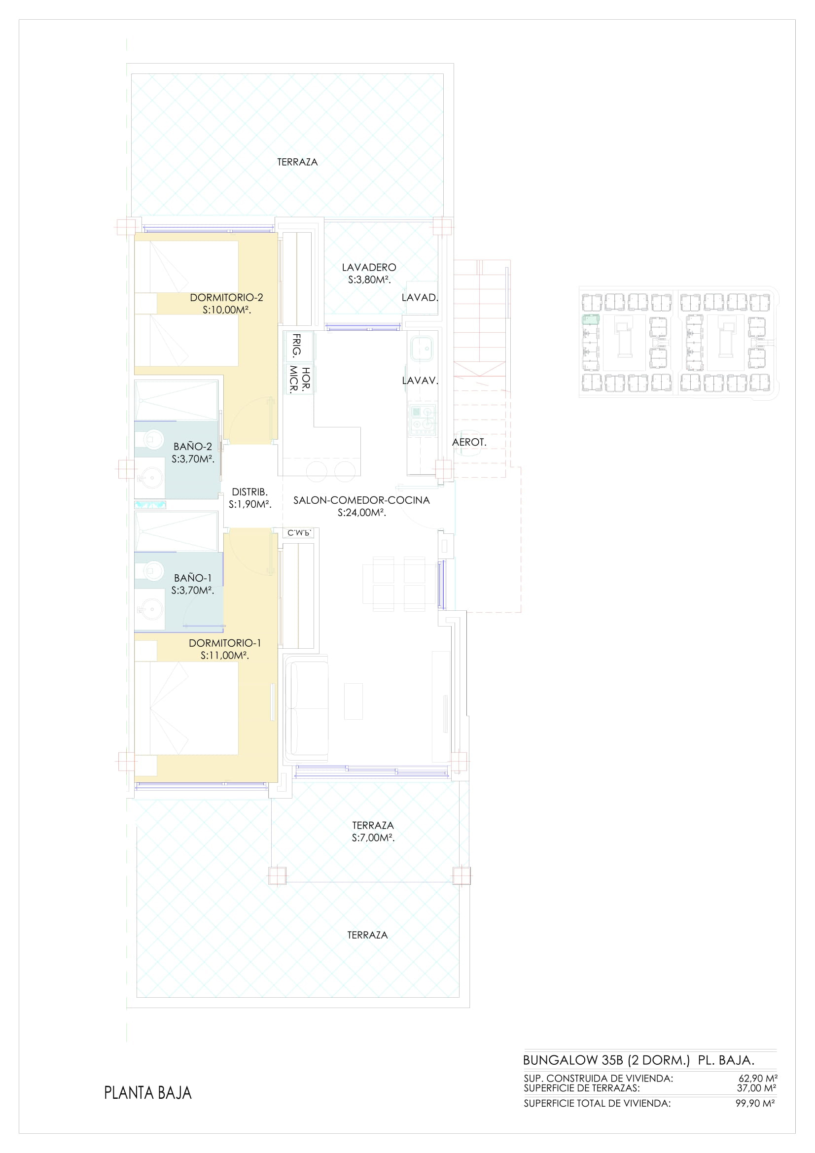 Gelegen in de charmante stad Torrevieja, biedt dit wooncomplex een selectie van 42 eigendommen, waaronder bungalows, high-bungalows en low-bungalows. De locatie is ideaal voor degenen die willen genieten van het leven dicht bij de zee, aangezien het slechts 3,5 km van de kust ligt. Bovendien is de dichtstbijzijnde luchthaven op 21 km afstand, wat de toegang vergemakkelijkt voor frequente reizigers. De woningen zijn ontworpen om comfort en functionaliteit te bieden, met opties van 2 en 3 slaapkamers en 2 badkamers, die aan verschillende gezinsbehoeften voldoen.
