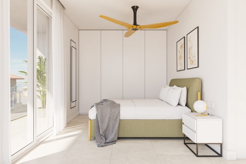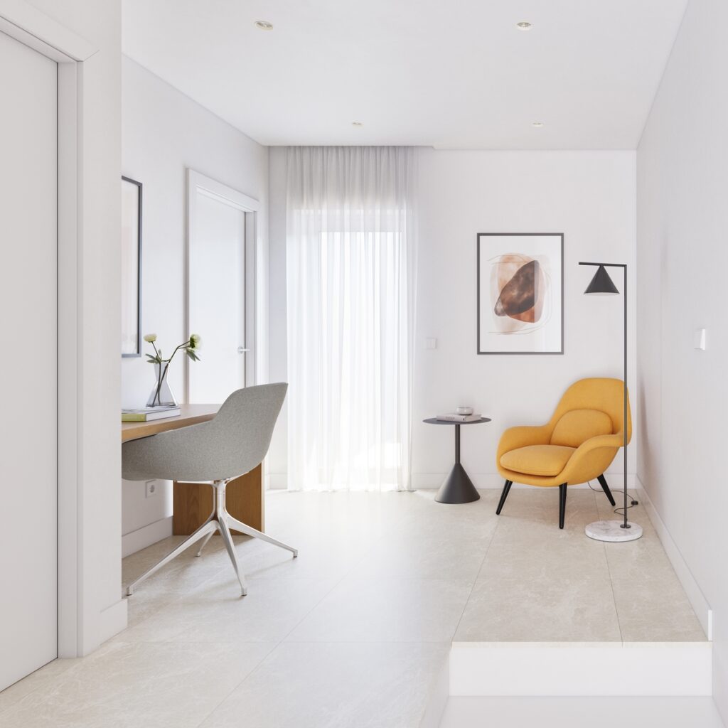 Het buitenontwerp van deze herenhuizen combineert strakke lijnen en bekledingselementen, waardoor een unieke, moderne en elegante esthetiek ontstaat. Elke woning heeft een privépatio en -terras, zodat je het hele jaar door buiten kunt genieten van het mediterrane klimaat. Bovendien zorgen de witte metalen structuur en de glazen balustrade van de buitentrappen voor helderheid en visuele ruimtelijkheid. Het project beschikt over een privézwembad en een gemeenschappelijk zwembad, ideaal om te ontspannen en te genieten van de rustige en residentiële omgeving.