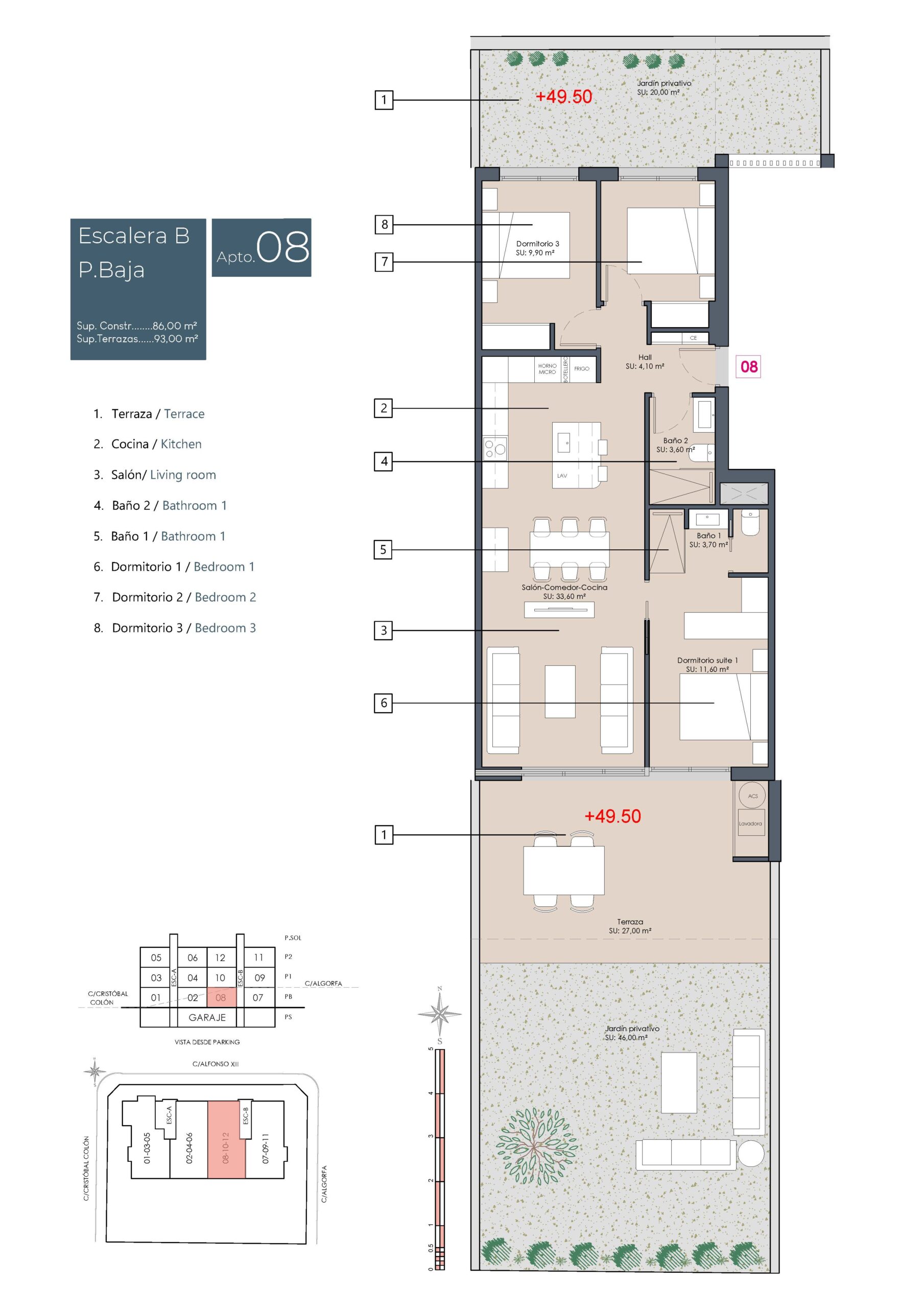 Binnenin vallen de woningen op door hun eigentijdse en functionele ontwerp. De appartementen, begane grond en penthouses hebben drie slaapkamers en twee badkamers, wat een ruime en goed ingedeelde ruimte biedt voor het hele gezin. De porseleinen tegelvloeren geven een vleugje elegantie en zijn gemakkelijk te onderhouden. Ingebouwde kasten in de slaapkamers zorgen voor efficiënte opslag, terwijl de pre-installatie van airconditioning het hele jaar door een comfortabel klimaat garandeert. Elk detail is zorgvuldig overwogen om een gastvrij en modern huis te bieden.
