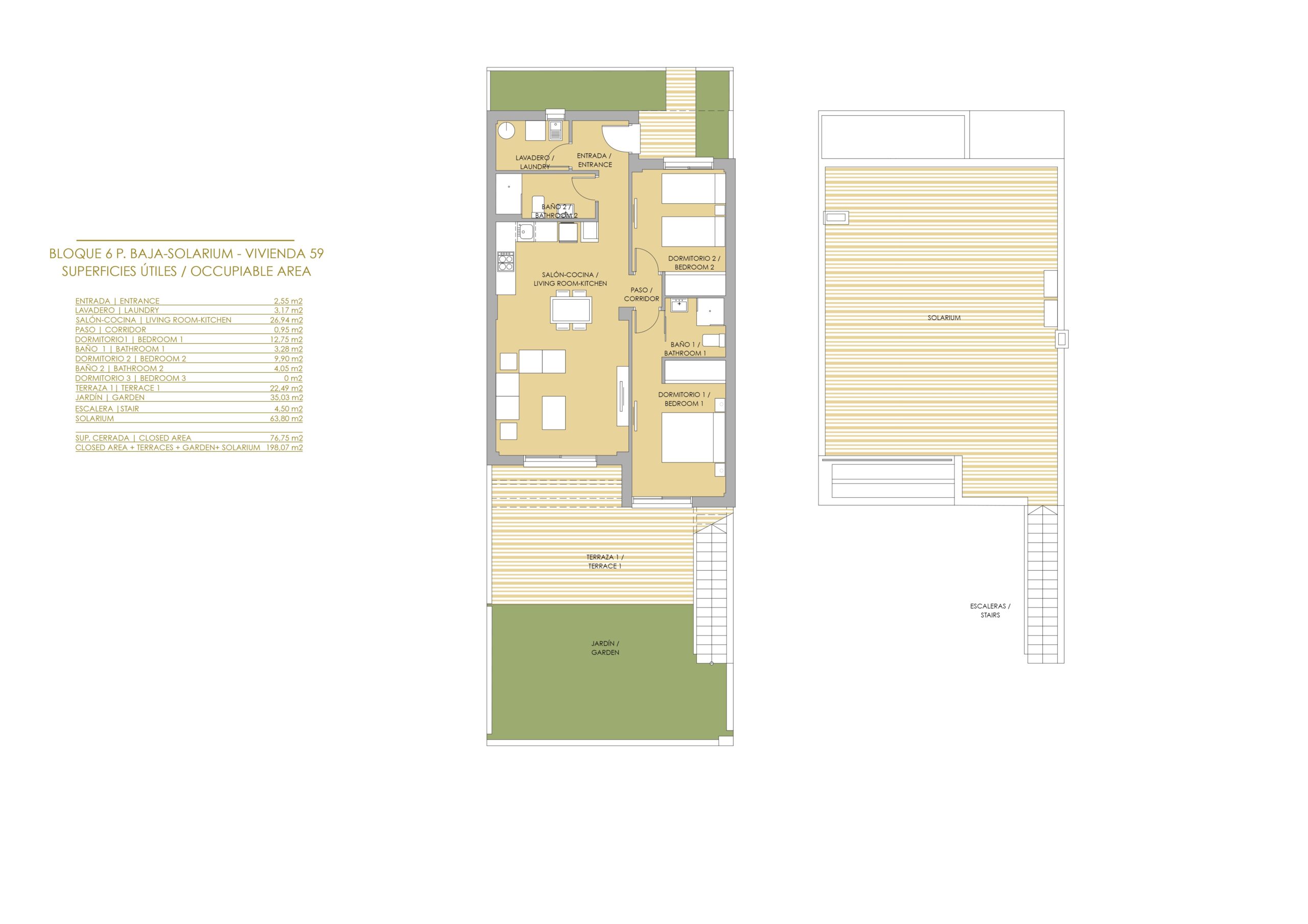 De buitenruimtes van deze woningen zijn ontworpen om optimaal te genieten van het mediterrane klimaat. Elke woning heeft een terras, ideaal om buiten te ontspannen of te genieten van maaltijden in de open lucht. Bovendien bevatten sommige typologieën een solarium, wat een extra ruimte biedt om te zonnebaden of een privé ontspanningsruimte te creëren. De tuinen, aanwezig in bepaalde configuraties, bieden een vleugje natuur en een perfecte ruimte voor buitenactiviteiten. De toevoeging van pergola’s aan de buitenruimtes voegt een element van schaduw en stijl toe, waardoor het mogelijk is om zelfs op de zonnigste dagen van buiten te genieten.