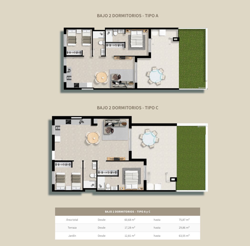Het interieur van deze woningen is zorgvuldig ontworpen om een moderne en functionele sfeer te bieden. Porseleinen vloeren geven een vleugje elegantie en duurzaamheid, terwijl elektrische rolluiken comfort en energie-efficiëntie toevoegen. De keukens zijn uitgerust met hoogwaardige apparatuur, wat het dagelijks leven vergemakkelijkt. Ingebouwde kasten optimaliseren de opslagruimte, waardoor orde en esthetiek behouden blijven. De indeling omvat opties van 2 of 3 slaapkamers en 2 of 3 badkamers, aangepast aan verschillende levensstijlen.