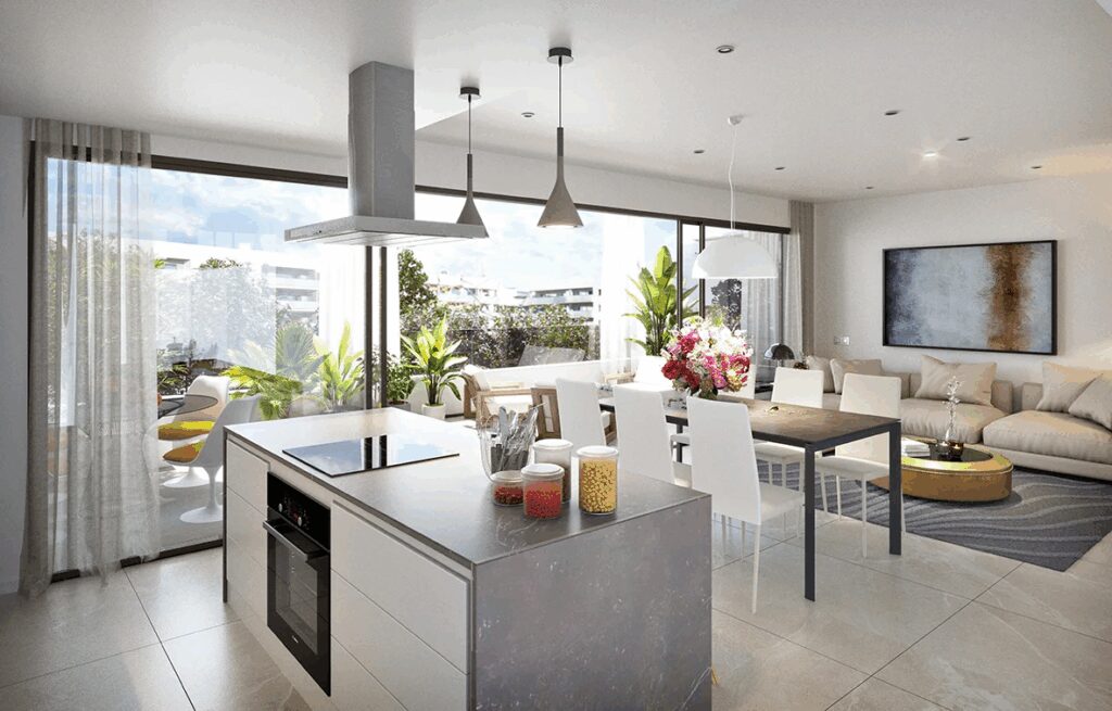 Het interieur van de flats en penthouses is ontworpen voor maximaal comfort en functionaliteit. Met een bebouwde oppervlakte van 112 m² en een woonoppervlakte van 103 m² heeft elk appartement drie tweepersoonsslaapkamers en twee moderne badkamers. De binnenruimtes zijn ruim en licht dankzij de grote ramen die natuurlijk licht binnenlaten en uitzicht bieden op de terrassen. De open keuken, uitgerust met hoogwaardige apparatuur, sluit naadloos aan op de woon-eetkamer, waardoor een open en uitnodigende ruimte ontstaat die ideaal is voor het dagelijks leven en voor entertainment. Alle appartementen zijn voorzien van efficiënte airconditioning en luchtkwaliteitssystemen, LED-verlichting en toiletten met laag verbruik, wat zorgt voor een laag energieverbruik en besparingen op de huishoudelijke rekeningen.