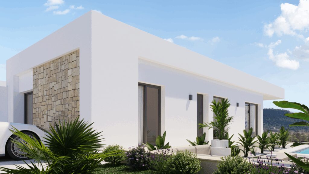Het huis onderscheidt zich door het architectonische ontwerp dat harmonieert met de omringende natuurlijke omgeving, met een moderne en elegante esthetiek. De gevels zijn gemaakt van lokale materialen zoals steen en hout, wat zorgt voor een gevoel van warmte en verbondenheid met het mediterrane landschap. De grote ramen maximaliseren niet alleen het natuurlijke licht, maar bieden ook een panoramisch uitzicht op de berg Puig Campana, de golfbaan en het omringende groene landschap. Elke villa heeft ruime terrassen en buitenzitjes, ideaal om te genieten van het weer en het uitzicht. Privézwembaden, naadloos geïntegreerd in het exterieurontwerp, nodigen uit tot momenten van ontspanning en vermaak in de privacy van je eigen huis. De zorgvuldig aangelegde tuinen zijn beplant met onderhoudsarme inheemse soorten, met respect voor de plaatselijke biodiversiteit en ter bevordering van een duurzaam milieu. De integratie van buitenverlichtingssystemen versterkt de architectonische schoonheid van de huizen in het donker en creëert een uitnodigende en veilige omgeving.