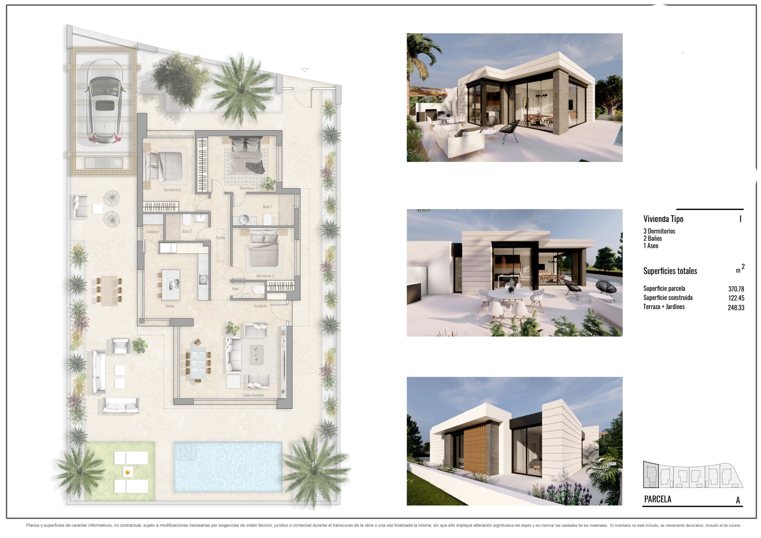 De villa’s van het Residencial de Obra Nueva in Pilar de la Horadada zijn ontworpen om een elegante en functionele omgeving te bieden in een bevoorrechte omgeving. Elke villa, gebouwd op een perceel van 370 m², heeft een privétuin met een zwembad, ideaal om te genieten van de warme mediterrane dagen. De terrassen, in totaal 248 m², bieden voldoende buitenruimte om te ontspannen, buiten te eten of te zonnebaden. De privéparkeerplaats biedt gemak en veiligheid voor de bewoners. De moderne architectuur van de villa’s wordt aangevuld met doordachte details en hoogwaardige materialen, waardoor een aantrekkelijk en gastvrij huis ontstaat. Het buitenontwerp is ontworpen om optimaal te kunnen genieten van de natuurlijke omgeving en het prachtige uitzicht op de golfbaan Lo Romero.
