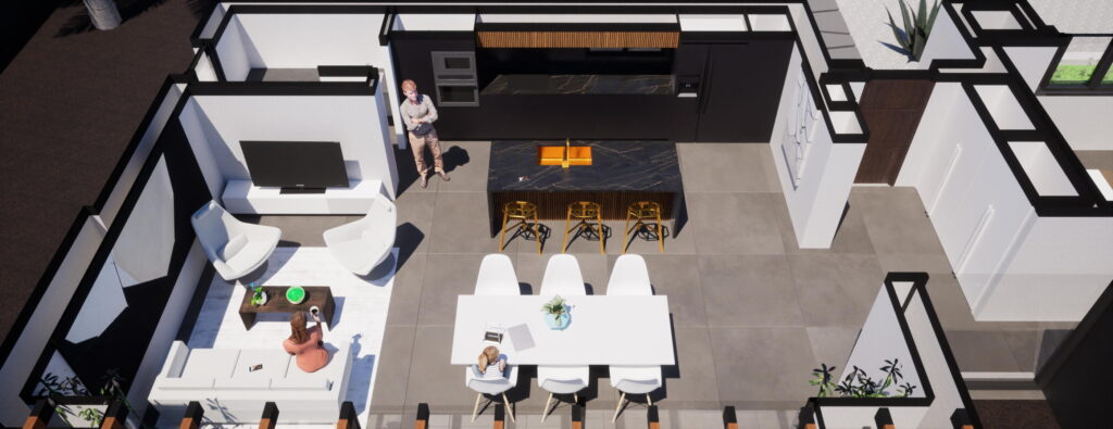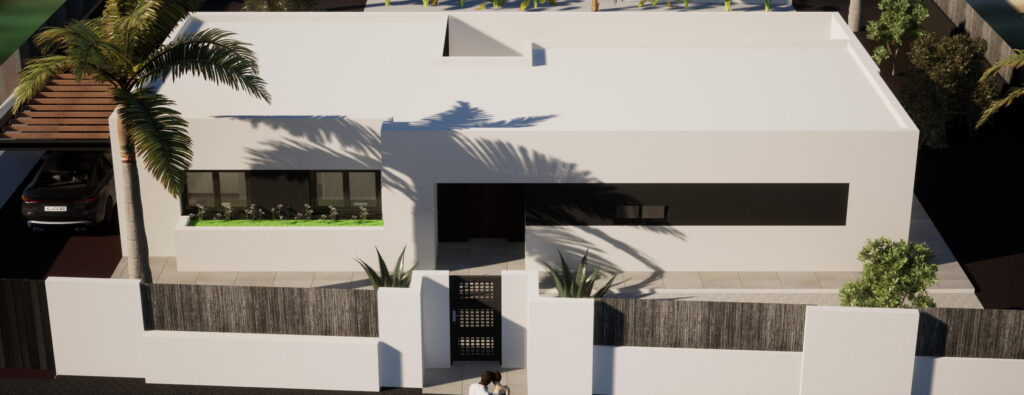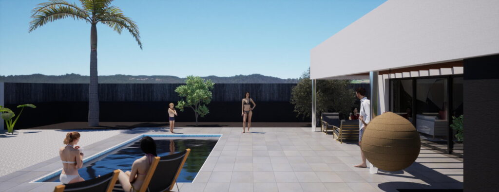 Het Ibizan-project is gearticuleerd in een L-vormige indeling, met een hoofdvolume waarin de woonkamer-keuken-eetkamer is gevestigd. Hoogtepunten zijn een groot glazen schuifraam dat verborgen is in de scheidingswand en uitkomt op de pergola en het terras met zwembad op het zuiden. Daarnaast heeft het een grote pergola boven de parkeerplaats, die extra overdekte buitenruimte biedt.
