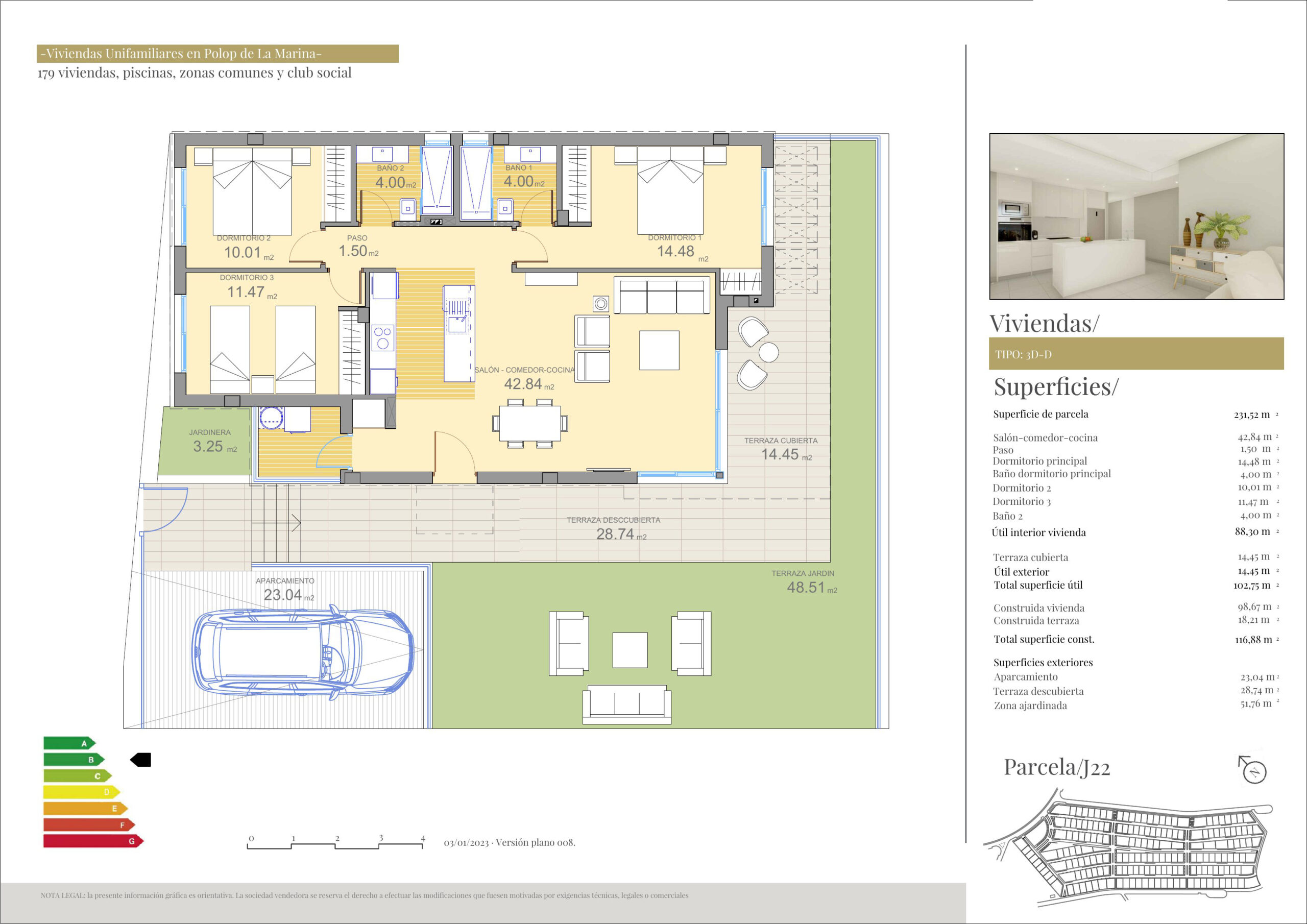 We bieden drie spannende woonopties om aan je behoeften te voldoen: Marina, een gelijkvloerse woning met 3 slaapkamers en 2 badkamers; duplex met twee verdiepingen met 3 slaapkamers, 2 badkamers en gastentoilet; en Estela, een gelijkvloerse woning met 3 slaapkamers en 2 badkamers. Ze hebben allemaal een ruime woon/eetkamer met open keuken en parkeerplaats voor één auto. Bovendien kun je ervoor kiezen om een privézwembad en solarium toe te voegen om je ideale ruimte persoonlijk te maken. Vind de perfecte woning die bij jouw levensstijl past in ons exclusieve wooncomplex!